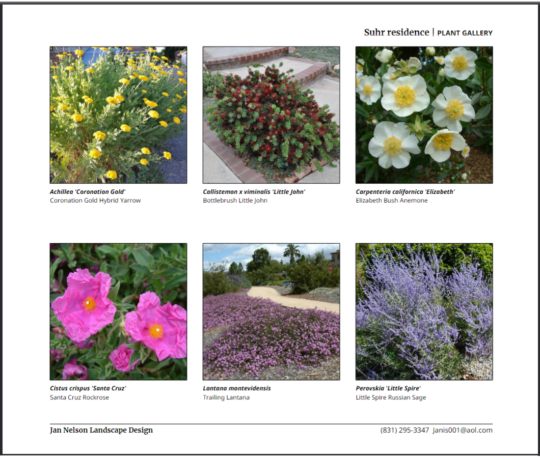 Plant selection is often a key part of the process. Based on your location, sun exposure, soil conditions, water needs and maintenance preferences, I can recommend plants that are well-suited to your site and climate. I use the PlantMaster application to choose the best plants for your situation. garden plan example - plant gallery I email you a link with plant photos and descriptions to review. An easy feedback form that notes your “likes”, “maybes” and “no thanks” is automatically sent back to me. Your choices are narrowed down easily and it’s fun to use. I provide guidance on plant placement, spacing and care to help ensure long-term success.